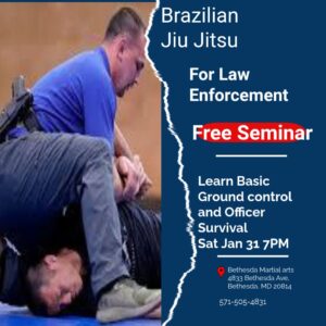 Free Brazilian Jiu-Jitsu training for law enforcement in Bethesda, MD: Learn control, restraint, and duty-belt tactics in this two-hour hands-on session. 🥋